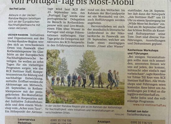 Was für ein Woche! Theater, Kino, Konferenzen, selbst im Internet konnte man verfolgen, was zwischen dem 20. und dem 25. September in Rothenklempenow los war. Nach der Eröffnung durch Bettina Martin machte uns am Tag der Möglichkeiten die Theatertruppe „vollehalle!mit ihrer Klimashow Mut für die Herausforderungen, die da kommen. Am Tage der Natur erhielten wir in verschiedenen Vorträgen Einblick in die Aktivitäten von Rewilding Oder Delta und dem Naturpark Am Stettiner Haff. Am Tag der Dorfläden wurde der Film „Alles, was es braucht“ gezeigt. In dem anschließenden Gespräch mit Filmemacherin Antje Hubert diskutierten das Publikum lebhaft über den Wert gemeinsamer Treffpunkte im Ort. Am Tag der Gemeinschaft wurde vor allem aber das Reidenzprogramm, als Schwerpunkt behandelt, welches 2023 sowie auch die Europäische Nachhaltigkeitswoche fortgeführt werden soll. Die portugiesische Delegation aus Odemira und Umgebung genoss die Beiträge und Exkursionen und einige konkrete Ideen und vertiefte Kontakte sind entstanden. So soll in Portugal nun auch ein Weltacker und ResidenZ Programm entstehen. Alles in allem eine Woche für mehr Nachhaltigkeit in vielen Bereichen und mit über 300 Besuchern, eine tolle Vernetzung der Akteure.